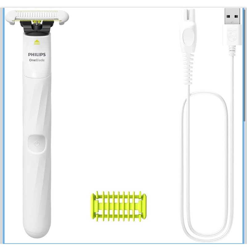 Itens inclusos: 1 Aparador OneBlade Intimate, 1 Lâmina SkinProtect, 1 Pente de 3 mm, 1 Cabo de carregamento USB-A (adaptador de tomada não informado).