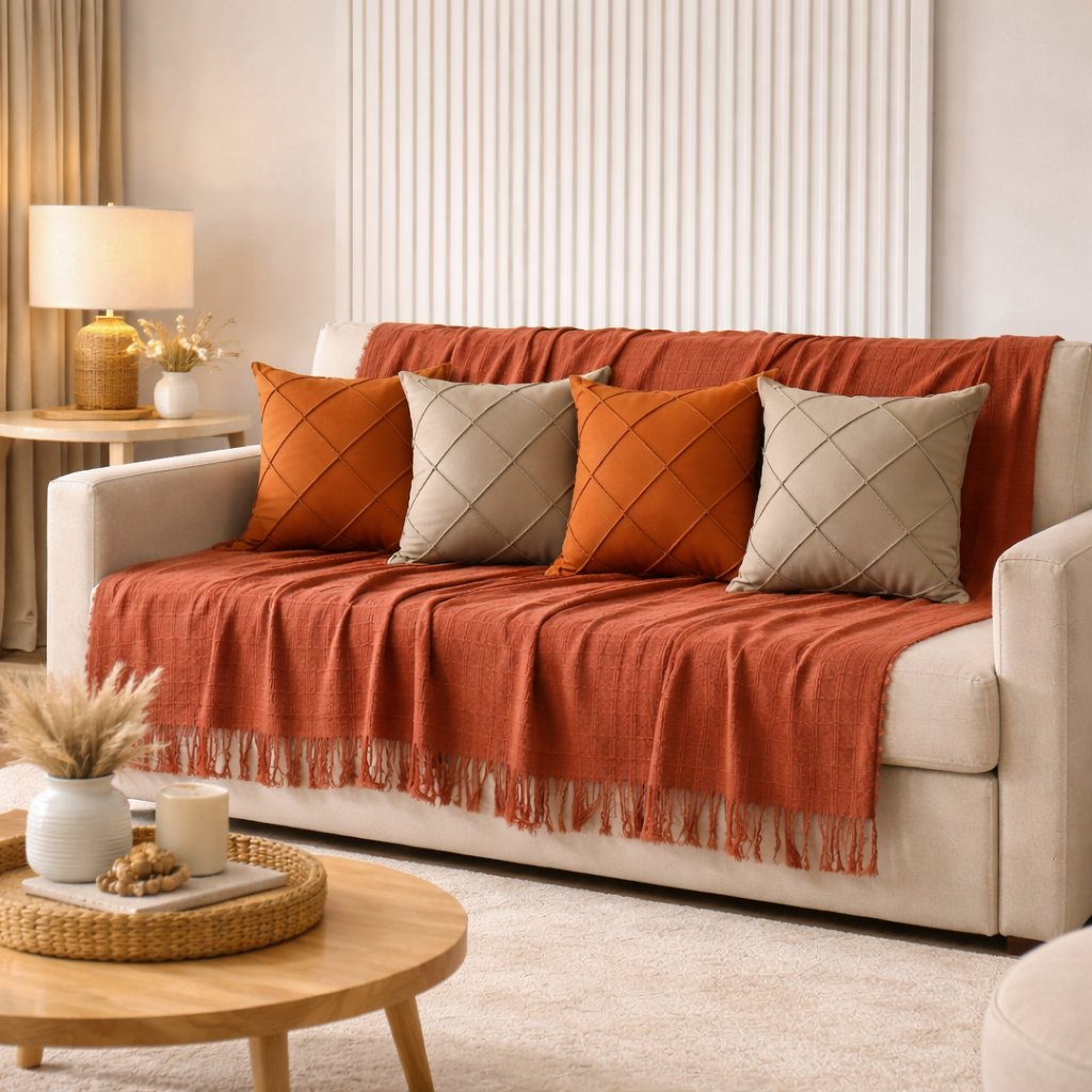 Além de decorar e harmonizar o espaço, a manta atua como uma barreira protetora contra poeira e desgaste do móvel, podendo também ser utilizada como colcha.